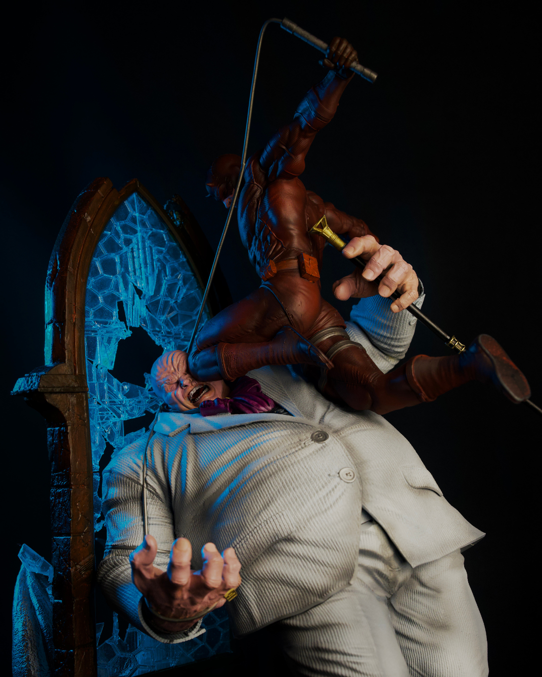 Cattura l'intensità viscerale della storica rivalità Marvel con questo diorama mozzafiato. La scena immortala Daredevil in un attacco aereo dinamico contro un mastodontico Kingpin, davanti a una vetrata gotica in frantumi che aggiunge un tono drammatico e cinematografico all'intera composizione.